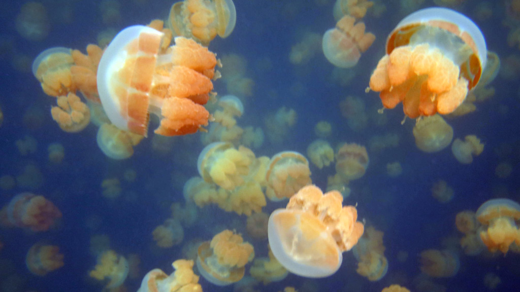 The next question was obviously ‘how?’ How does it happen that on one island of the small archipelago of Palau, in the middle the Pacific Ocean, in a completely enclosed lake, there lives a colony of jellyfish, who have lost their ability to sting, and therefore kill, anything? Being jelly FISH – these guys are obviously not living off fresh air. How does that work?